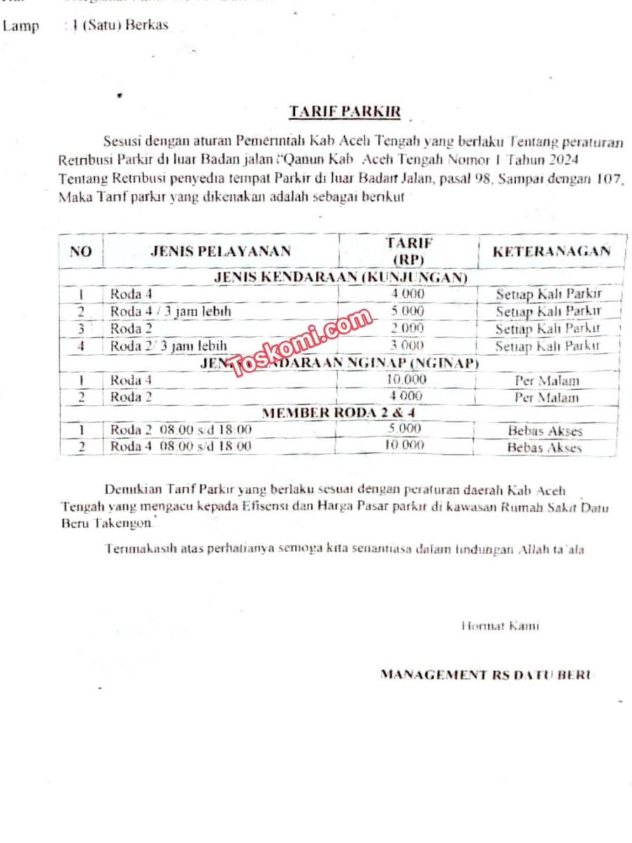 Diketahui juga dalam selebaran surat yang di tempelkan di pintu keluar parkir RSUD itu bahwa ketentuan tarif juga sudah di atur dalam Qanun Kabupaten Aceh tengah nomor 1 tahun 2024 tentang retribusi penyediaan tempat parkir diluar badan jalan pasal 98 sampai dengan pasal 107.